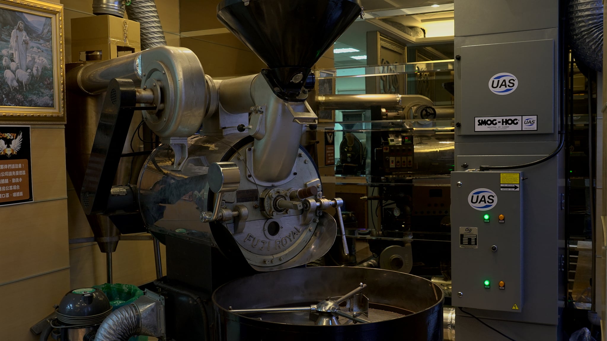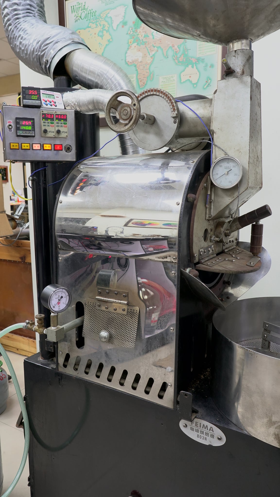介绍了公司所处的周围,都是住宅区;机器在此demo近一个多月不管是客人来看烘焙(每一次试烘都超过3锅),最大量是用15公斤连烘7锅,没有任何一位邻居来关心过咖啡香味从何而来,完全看不到烟,只能闻到咖啡豆香,看你烘的是什么豆就有什么味道。客人带蜜处理来,闻到的是茶香、花香,正确保留了原始食物的味道,除去了加工过程中的焦味、烟尘、微粒,就算你直接在出口处闻味,就是咖啡豆的熟香了。